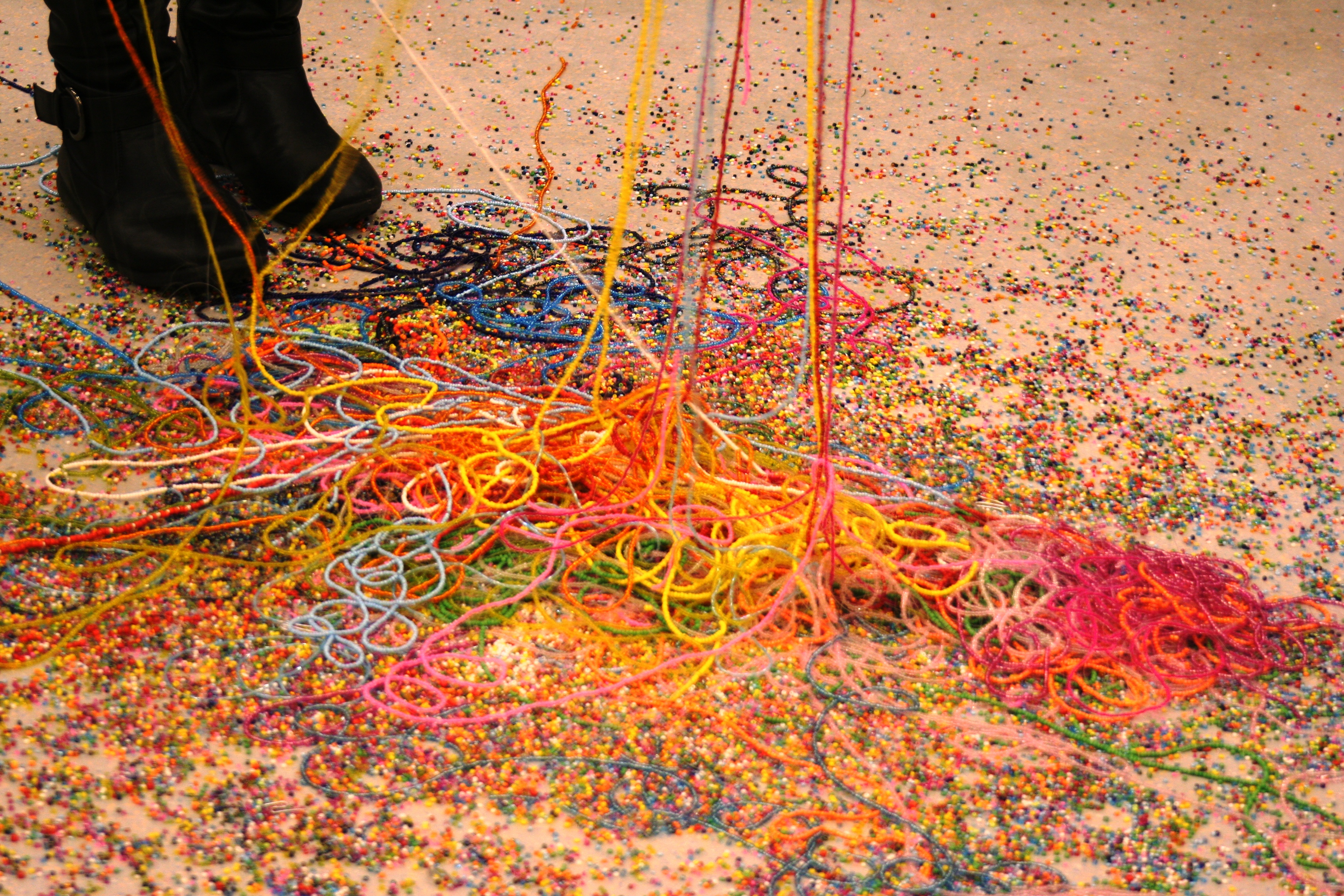 threaded on twine and hung from the ceiling of the gallery. The glass bead strings