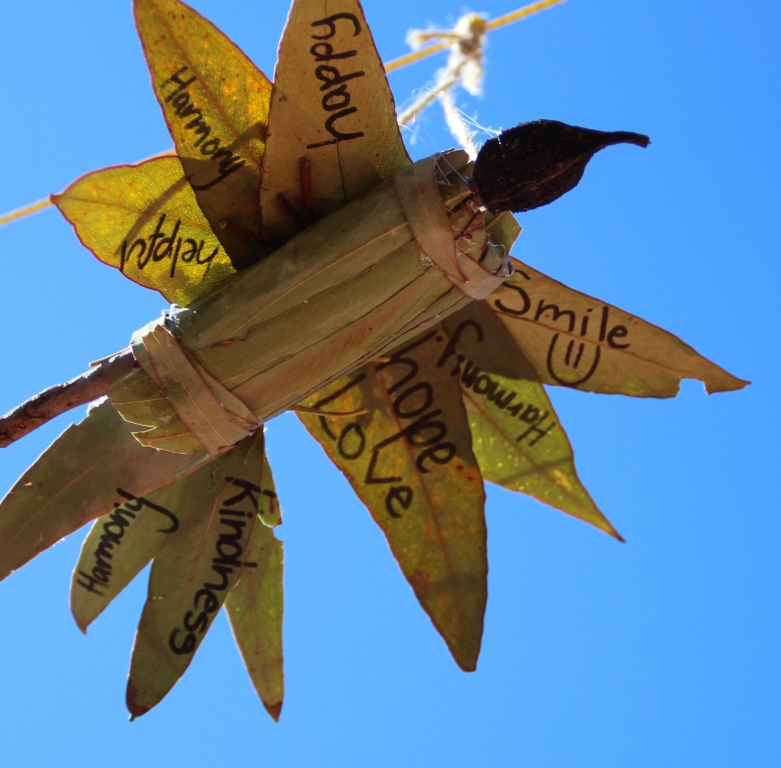 Children made doves with gum nuts, eucalyptus leaves, sticks and biodegradable string. Each dove had positive messages written on them that they would being to the world.