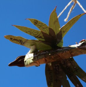 Children made doves with gum nuts, eucalyptus leaves, sticks and biodegradable string. Each dove had positive messages written on them that they would being to the world.